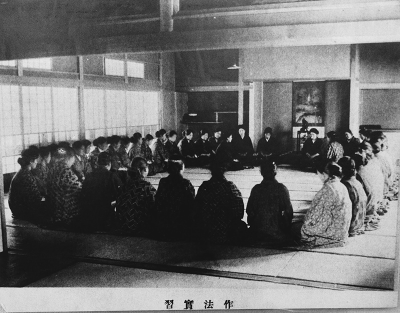 大正12年(1923)作法実習 2025 11/11 学校の歴史 2025年11月7日 大正12年(1923) 作法実習 ・当時の授業風景・写真は作法の実習である。・朝の朝礼に始まり修身・地理・歴史・習字・音楽・理科(実験有)・数学・作法(写真)・裁縫・家事・体操・遊戯(ダンス)・生花などが行われていた。 学校の歴史 大正12年(1923)家庭会主催料理講習会